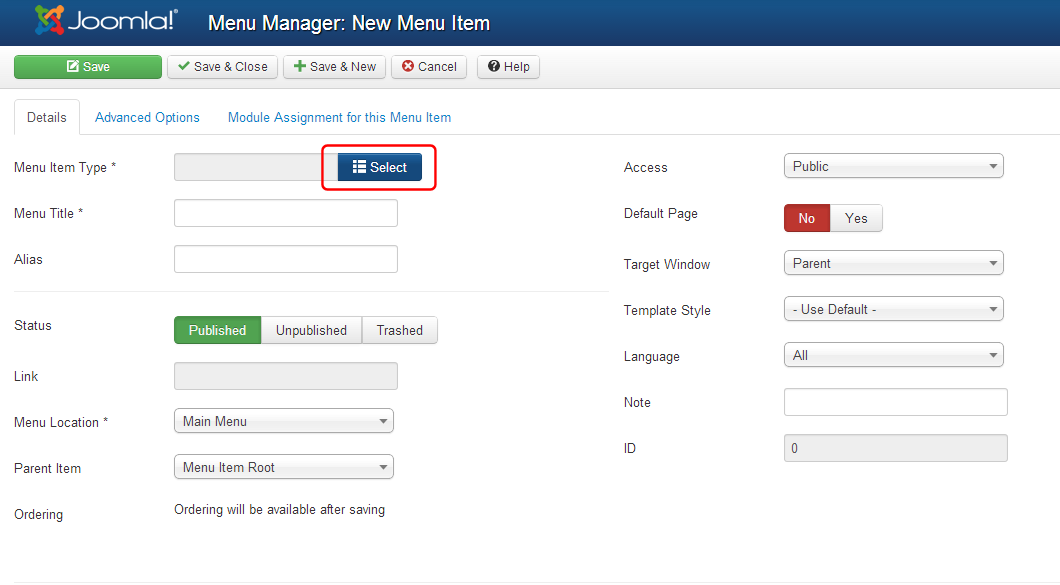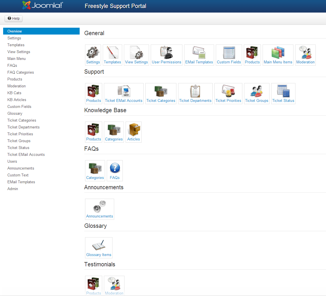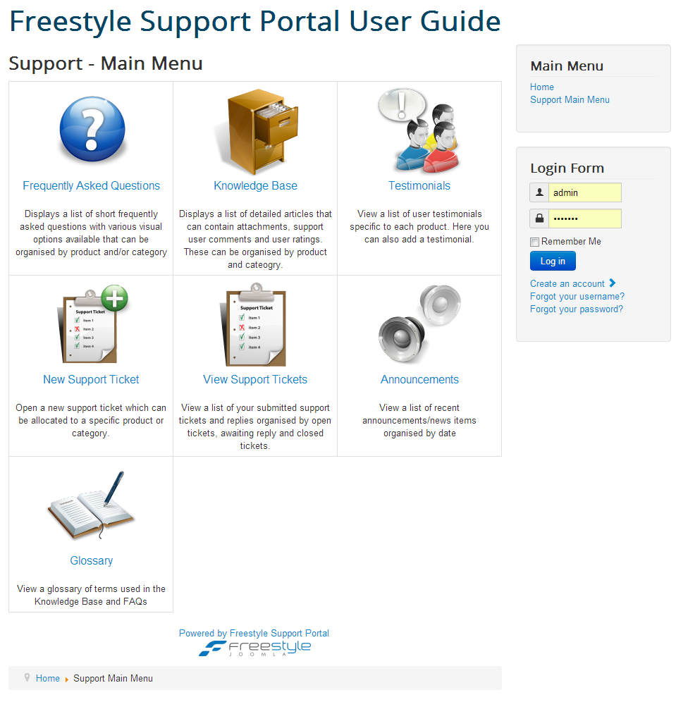 Once you have installed Support Portal, the quickest way to get started is to create a new Joomla menu item on your site. Set the menu item type to Freestyle Support -> Main Menu.