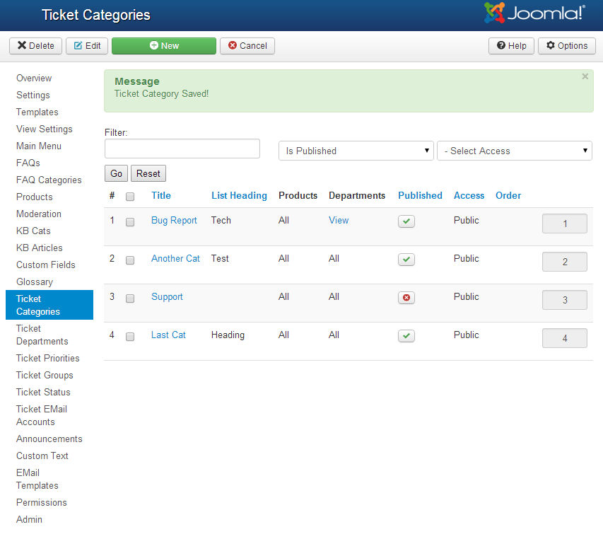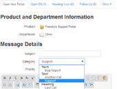 Categories are the final grouping level for support tickets. These are selected using a dropdown when the user is filling in the rest of the ticket details. To configure the categories for your site, goto Components -> Freestyle Support -> Ticket Categories. This gives a standard Joomla interface for creating a list of items.