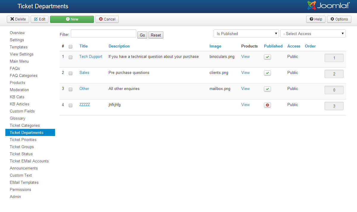The next part of the ticket open system is the Department selection. Here your users can choose which department that their support ticket is related to. To configure the departments for your site, goto Components -> Freestyle Support -> Ticket Departments. This gives a standard Joomla interface for creating a list of items.