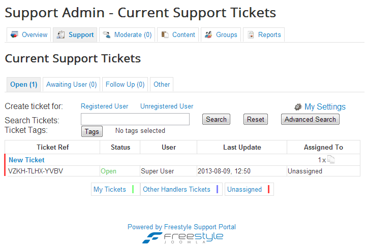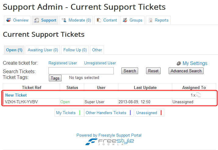 A user can view their existing tickets by visiting the View Support Tickets link on the main menu or with a Support: View Tickets menu item type. Here they can view any handler replies, and also post files and new messages to the ticket.